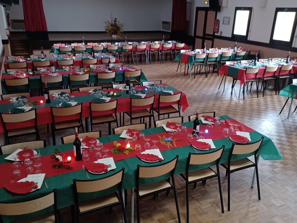 Pour 12h00 : Repas des anciens, tables mises en place avec le couvert et décorées, plats en cuisine en attente !