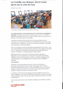 Article Le Populaire du Centre du 16 mai sur la conférence d’Hervé COVES tenue a La Croisille sur la crise de l’eau et le dèréglement climatique