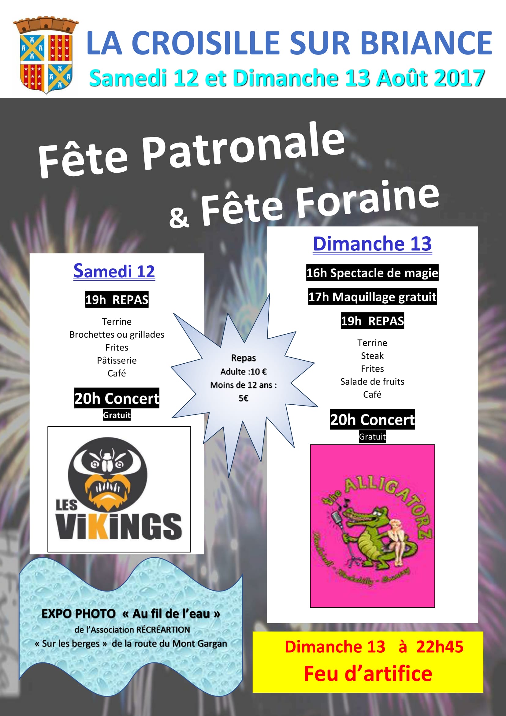 Durant ces deux jours les animations se sont succédées, fête foraine avec manèges , auto tamponneuses structures gonflables, tir à la carabine, confiseries etc.. Le dimanche après-midi spectacle de magie et de maquillage pour les enfants , sans oublier les deux grands concerts gratuits sur le podium de la place avec le groupe de pop/rock « Les Vikings » le samedi soir et celui de rockabilly « The Alligatorz » le dimanche soir avant le tirage du fameux feu d’artifice magnifique qui a illuminé le ciel de La Croisille..