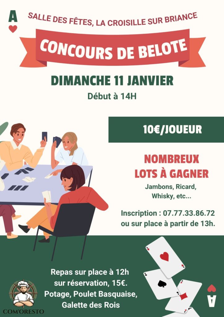 Dimanche 11 janvier : 12h00 Repas et concours de belote à la salle des fêtes organisé par un particulier