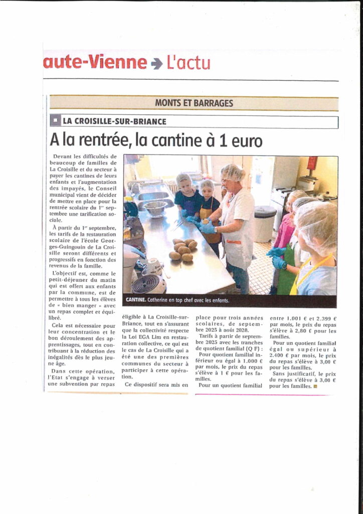Article Le Populaire du 4 juillet sur la cantine à 1 euro