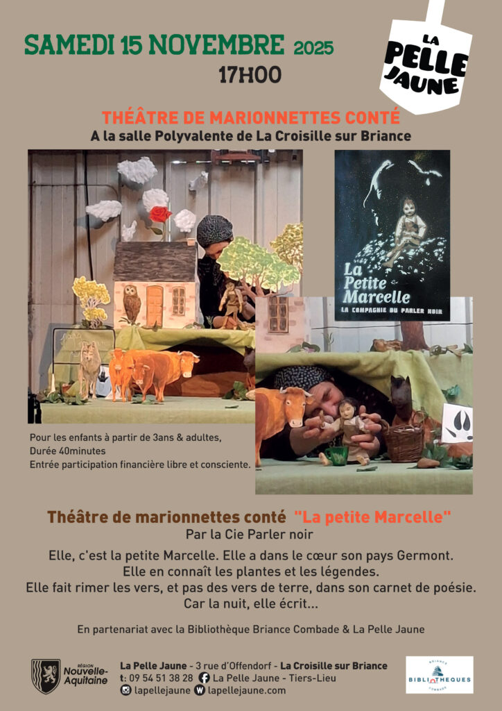 Samedi 15 novembre : 17h00 Théâtre de marionnettes conté « la petite Marcelle » par le Cie Parler noir à la salle des fêtes de La Croisille en partenariat entre la bibliothèque briance-Combade et la pelle jaune