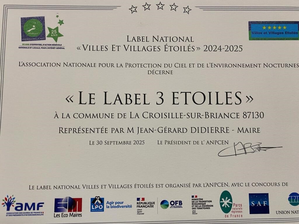 Confirmé par l’article du Populaire du 26 décembre sur la labellisation des villages étoilés du Parc Naturel de Millevaches en Limousin pour 2025 La Croisille-sur-Briance fini bien l’année avec le renouvellement à 3 étoiles de son label, elle est classée parmi les 14 communes sur les 125 du parc reconnu pour ses actions consacrées à la qualité de son ciel nocturne.