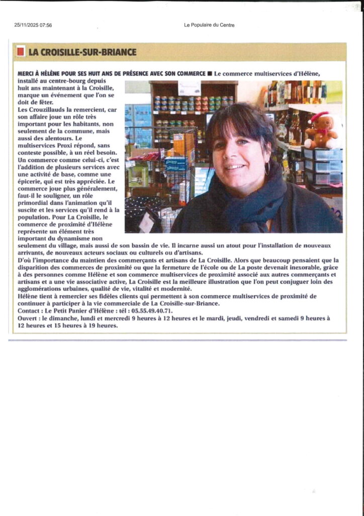 Article du Populaire sur Hélène 25 novembre 2025 ARTICLE Le Populaire du Centre DE CE MARDI 25 NOVEMBRE SUR LE MERCI A HELENE ET SON MULTISERVICES