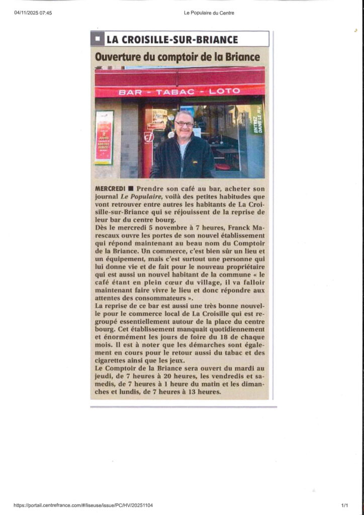 Article Le Populaire de ce 5 nov 4 novembre 2025 ARTICLE LE POPULAIRE DE CE MARDI QUI ANNONCE L’OUVERTURE DU COMPTOIR DE LA BRIANCE DEMAIN MERCREDI 5 NOVEMBRE A LA CROISILLE.