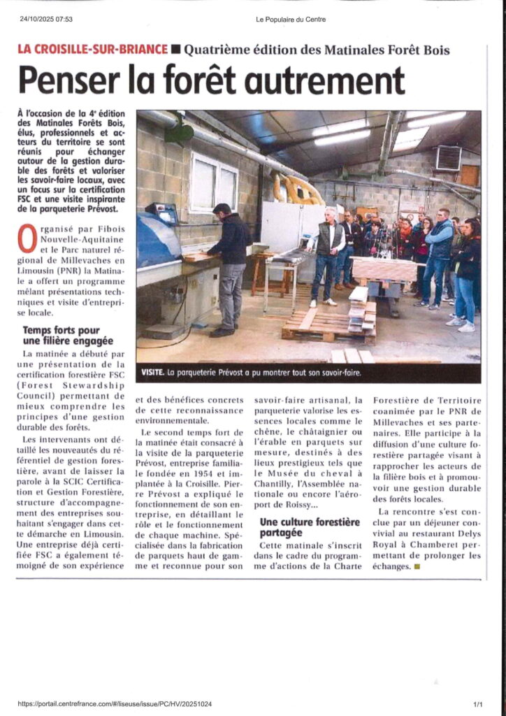 Article le populaire du 24 octobre sur la parqueterie Prévost 24 octobre 2025 ARTICLE LE POPULAIRE DU 24 OCTOBRE SUR LA MATINEE BOIS A LA CROISILLE AVEC LE VISITE DE L’ENTREPRISE DE PIERRE PREVOST