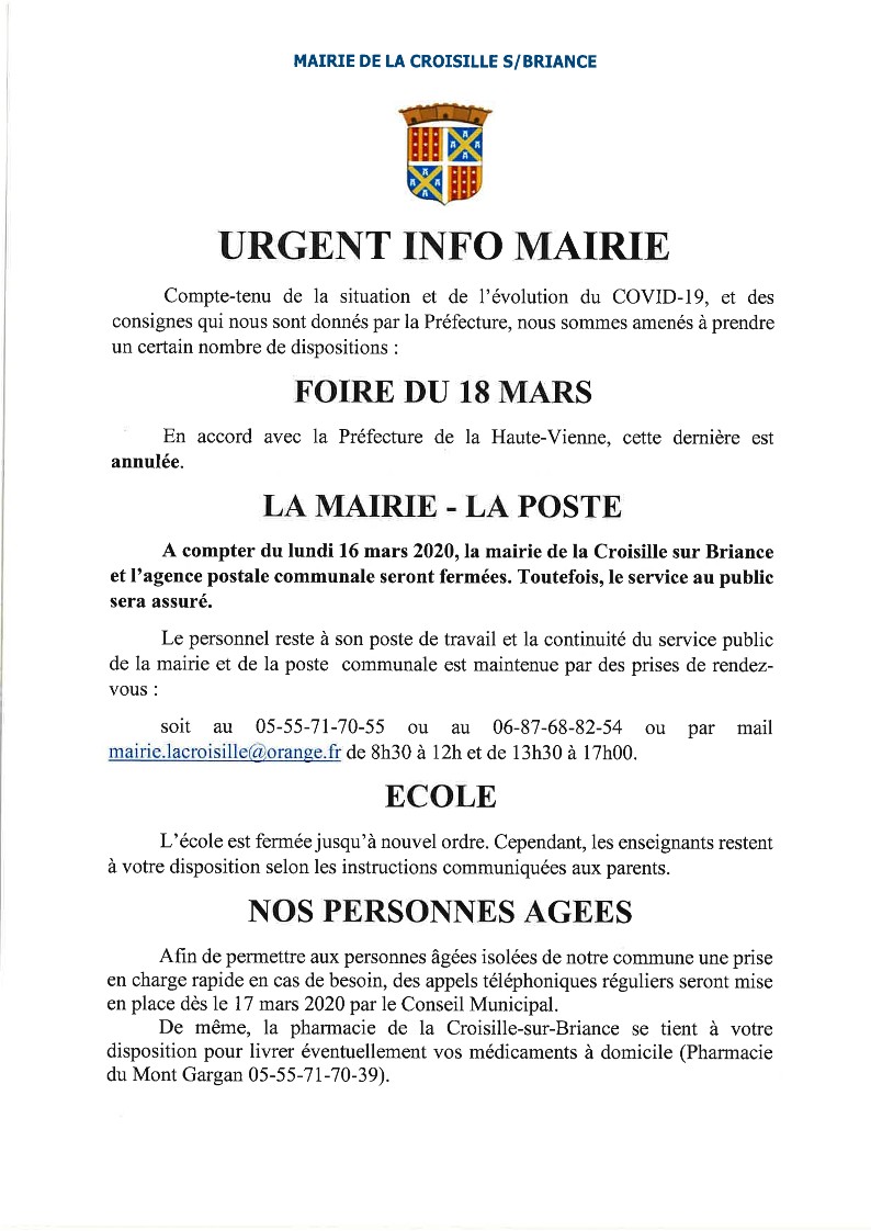 The Mairie of La Croisille sur Briance and the village post office are closed to the public until further notice. However, the services are maintained by appointment only – on 05 55 71 70 55.