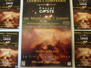 Ce vendredi 28 avril à 20h00, Pascal Coste, passionné d’astronomie, parrainé par Daniel Kunth, astrophysicien à l’Institut d’Astrophysique de Paris, est invité à la Croisille-sur-Briance afin de nous dévoiler un peu de ce mystère. Au travers de son récit, nous remonterons le temps : nous partirons d’ici et maintenant pour revenir au début, aux origines, c’est-à-dire au Big Bang, autrement dit la formation de l’univers. Des milliards d’années qui nous seront contés en l’espace d’une heure et quinze minutes.