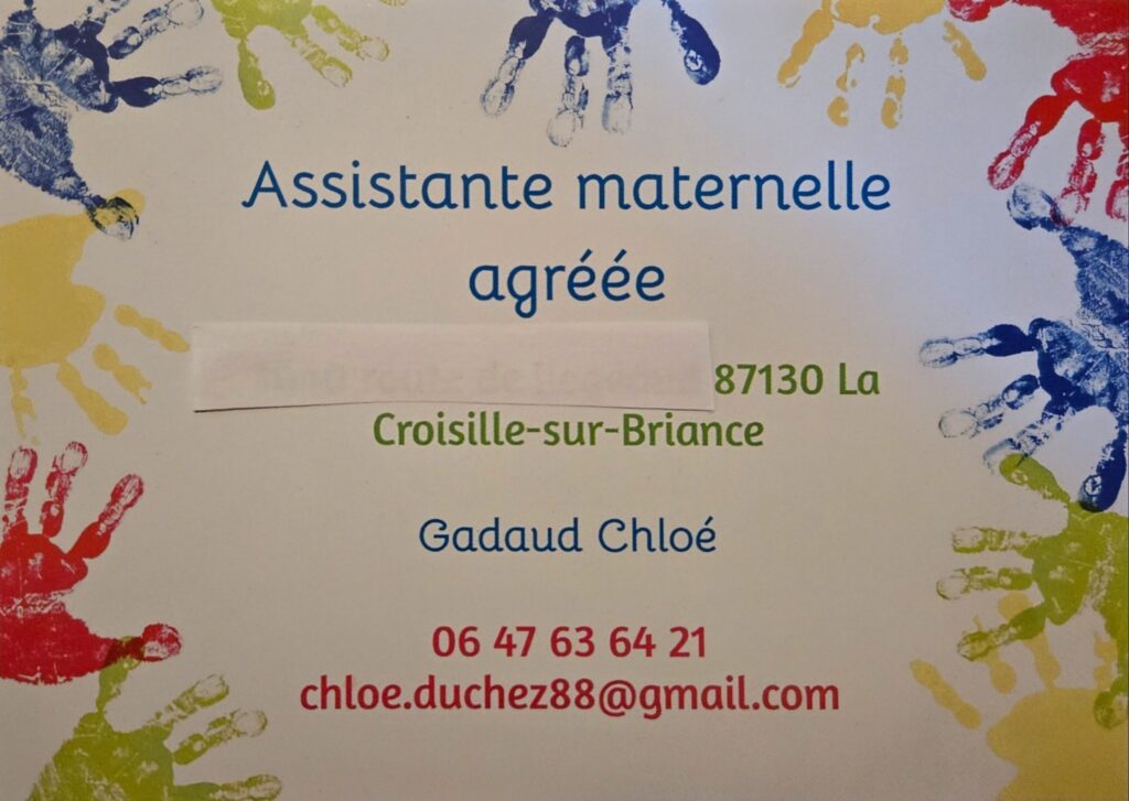 Chloé GADAUD est notre nouvelle assistante maternelle à la Croisille-sur-Briance vous pouvez la joindre au Tel : 06 47 63 64 21 ou par courriel Chloé.duchez88@gmail.com