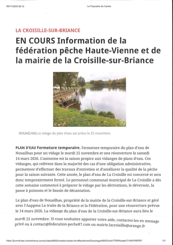 Article du populaire du 9 novembre sur la vidange du plan d’eau de Nouailhas