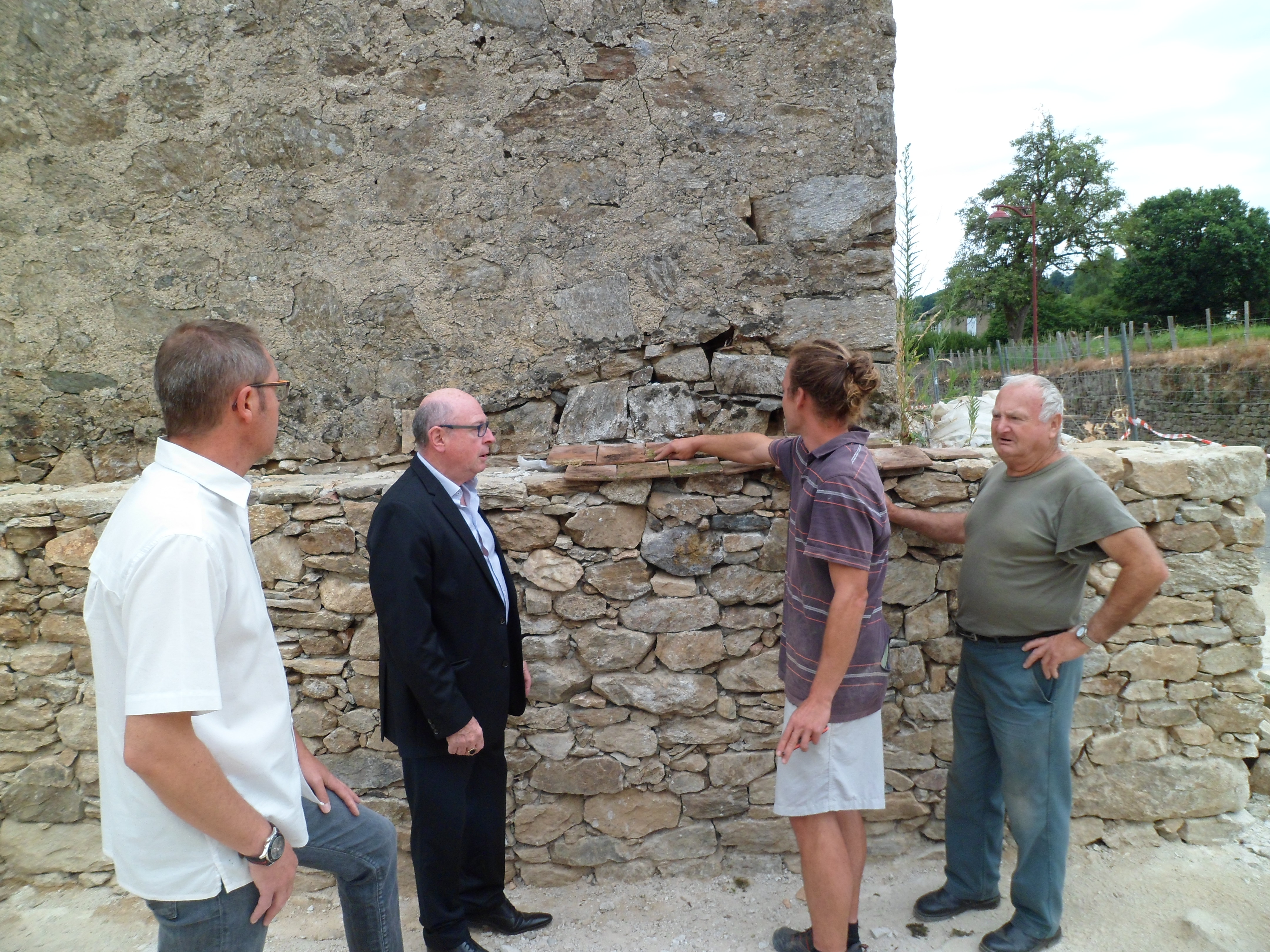 A la dernière réunion de chantier des travaux de restauration patrimoniale du lavoir, les personnes présentes ont pu admirer le travail des tailleurs de pierre de l’Association des chantiers jacquaires qui en sont maintenant à mettre en place les murs du bassin tandis que d’autres couvraient en tuiles plates le mur d’enceinte.